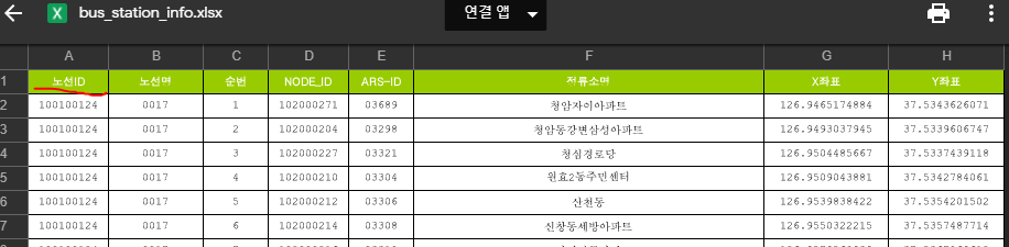 <tr><th>순번</th><th>정거장명</th><th>방향</th><th>x좌표</th><th>y좌표</th><th>arsId</th></tr>
