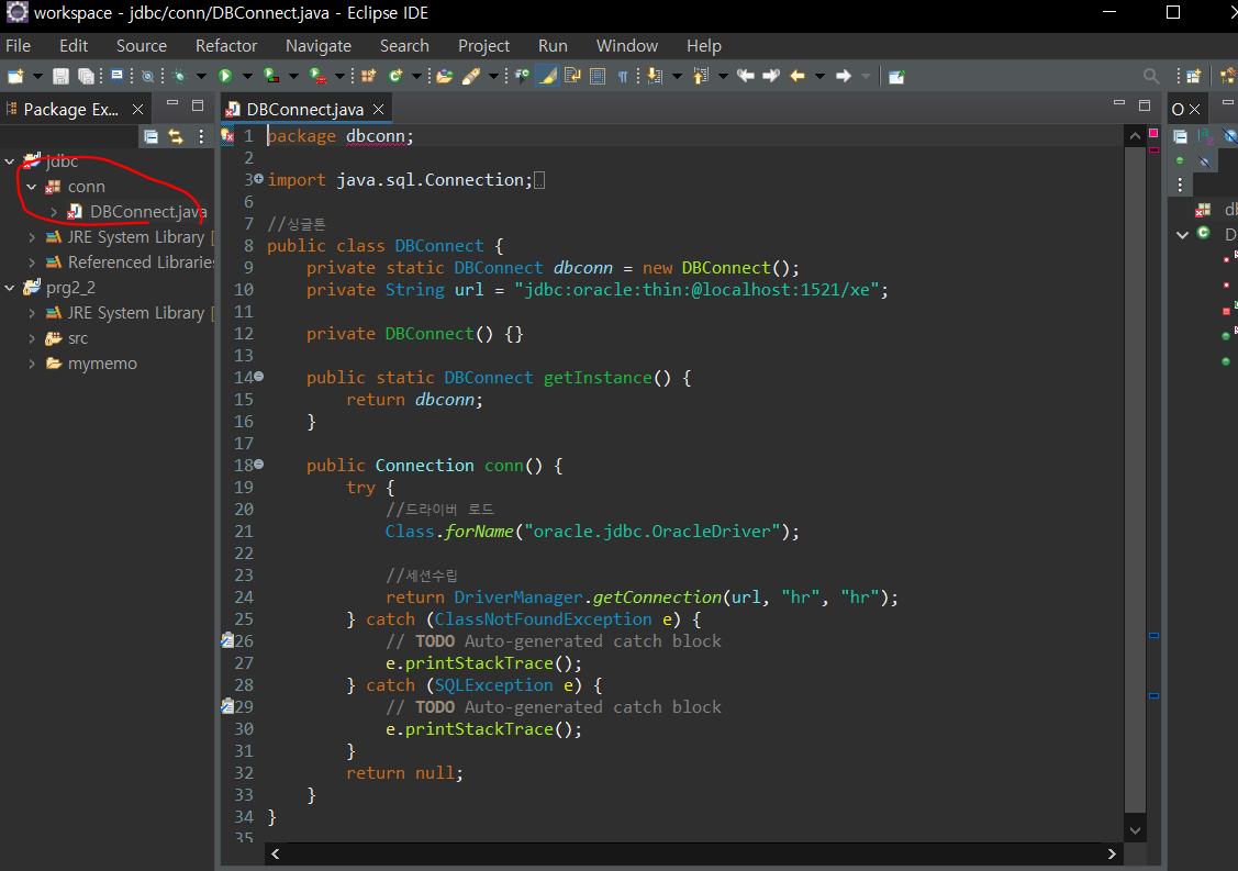▼1번째 줄 package 이름 dbconn에서 conn으로 수정.