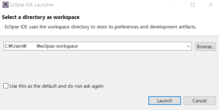 하단의 User this as the default and do not ask again 옵션을 체크하면 이클립스를 실행할때마다 위에서 지정한 경로를 기본 Workspace로 인식해서 더 이상 알림창을 띄우지 않는다.