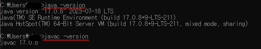 명령 프롬프트에서 "java -version" , "javac -version"입력으로 설치되었는지 확인 가능하다.