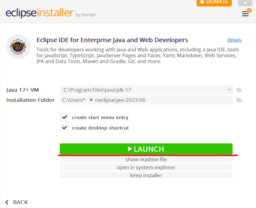 ▶ 4-1 설치가 완료되면 LAUNCH를 클릭하여 이클립스를 실행할 수 있다.