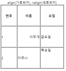 valign :셀의 내용을 top / middle / bottom 정렬 (valign = "top")