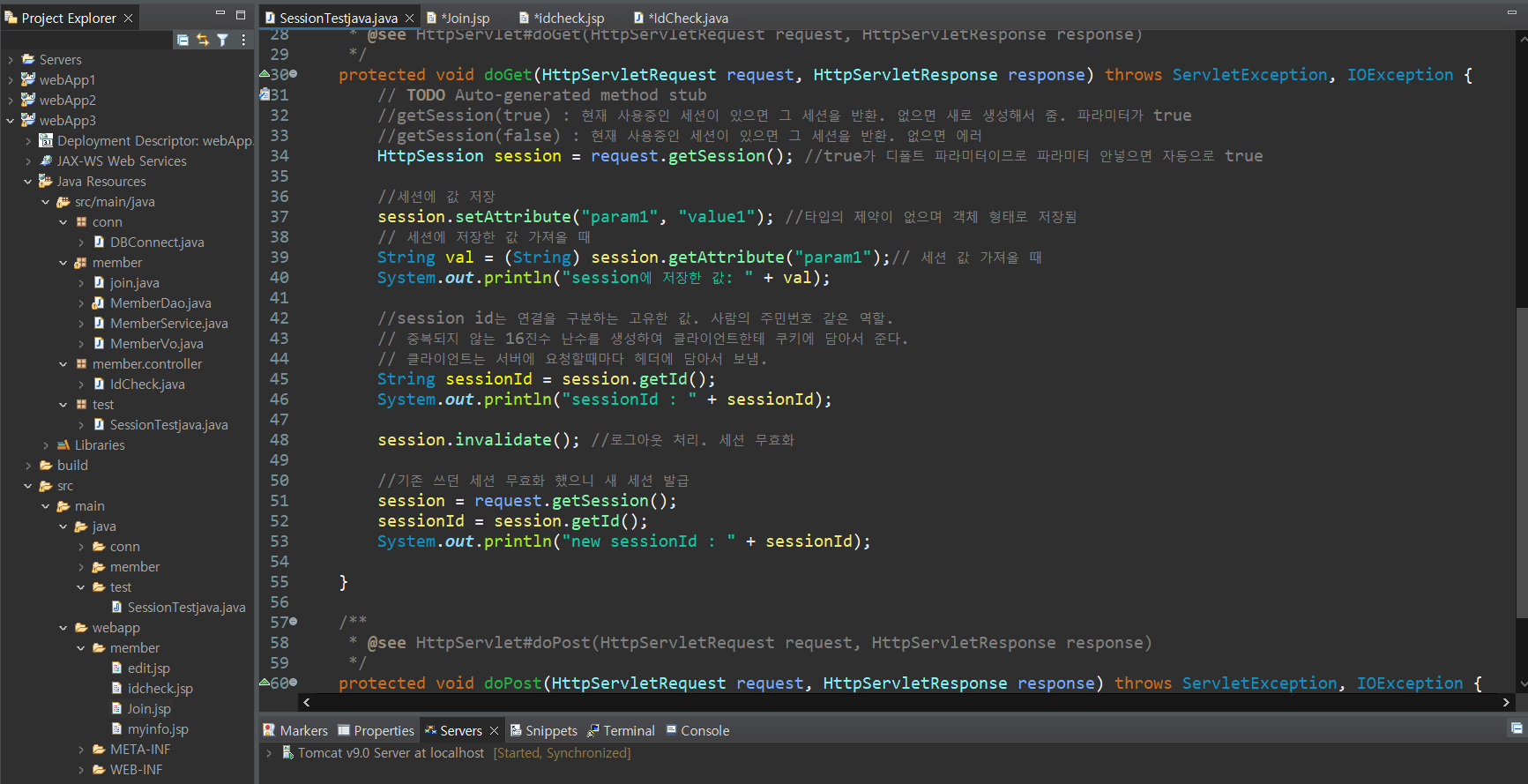 1. session 생성. => 세션은 자동 생성됨. 세션을 invalidate()해도 바로 새 세션이 생성된다.